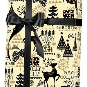 With homespun sophistication, Merry and Bright wrapping paper offers a gorgeous contrast to traditional red and green color schemes. Warm wishes of the holiday season, along with shapely reindeer, pinecones, whimsical Christmas trees, and pretty parcels, are silhouetted in black against a creamy eggnog-hued background. Shimmery gold elements and highlights elevate this pattern from humble to sublime!