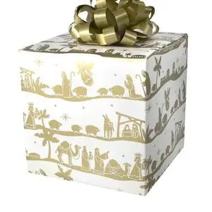 Sweetly rendered depiction of the birth of Jesus and the trek of the Three Wise Men to pay homage to Him. Printed in gold on a white background.