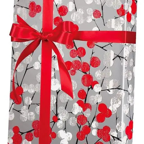 Wrap your presents in a nature-inspired print which calls to mind deep winter discoveries and vibrant holly berries. Silver wrapping paper featuring Christmas red, winter white, and black twiggy branches is versatile and well-suited for any man or woman on your Christmas gift-giving list. Wrap your gift with wrapping paper that is simple and sophisticated.